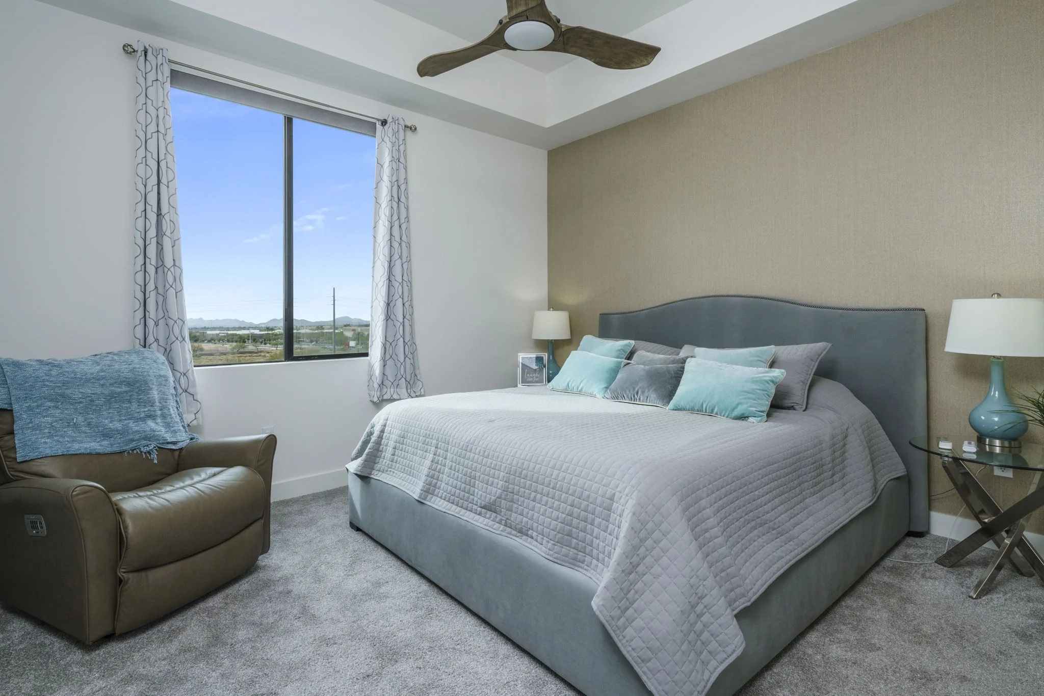Welcome to luxury indoor/outdoor living in the heart of Desert Ridge. This immaculate 2 bed, 2.5 bath - including an office - turnkey penthouse-level condo boasts high standards of comfort and quality with top-of-the-line appliances and amenities. 11' ceilings in the kitchen and living room, with a cozy gas fireplace. Each bedroom has a private ensuite bath. Imagine opening the massive dual sliding glass doors to your spacious 350sqft patio with a private kitchen/grill and unobstructed views of the Pinnacle Peak Mountains. Outdoor heater installed for maximum warmth in the colder months. Smart home technology. Custom remote-controlled drapes in both bedrooms and living room. 2 car parking stalls in the gated parking garage underground, with its own 12x6 storage unit.
