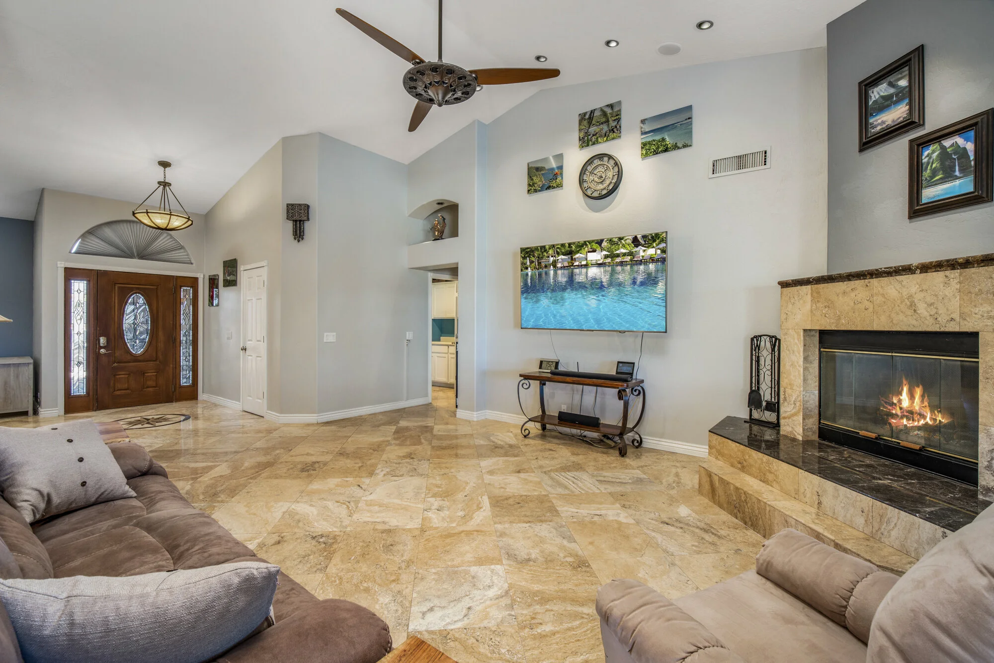 Step outside to enjoy a backyard oasis with a sparkling pool, covered patio, built in BBQ, fireplace & putting green.